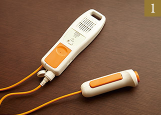 居室で体調が悪くなったり、転倒した時などのために、ベッド脇とトイレに緊急コールを設置しています。押すと、ドアの照明が点灯するほか、24時間常駐するスタッフのPHSにも発信。 室内のスピーカーを通して異常を知らせることができます。